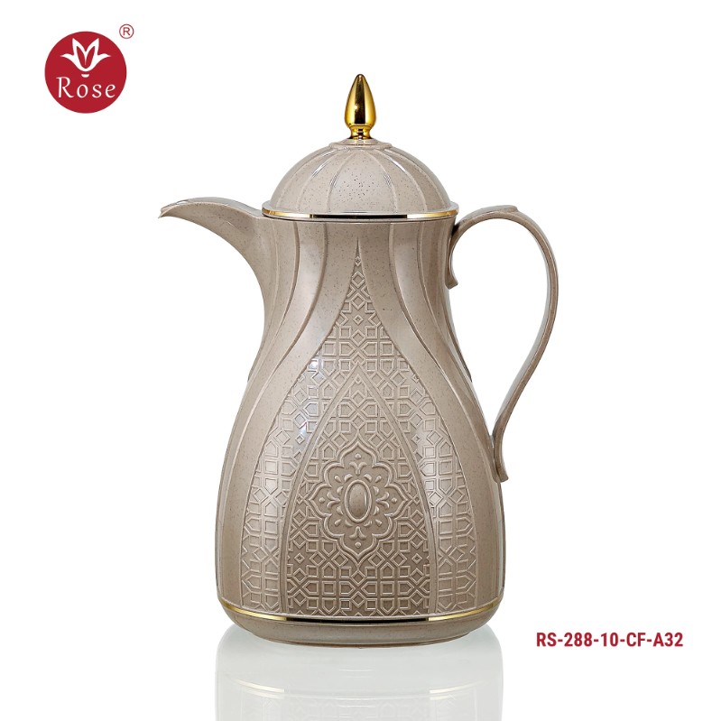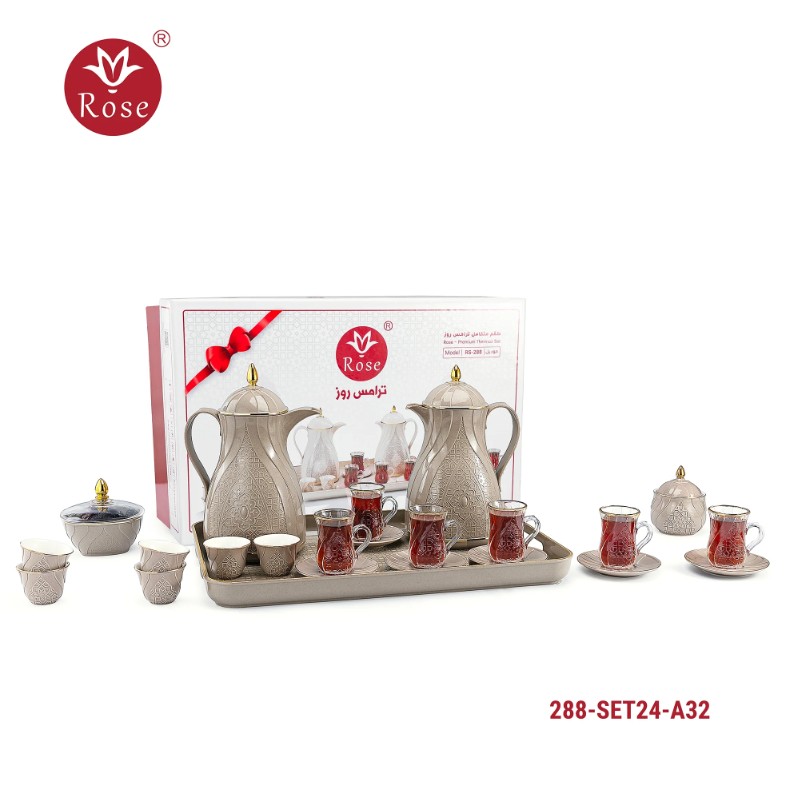 Rose Thermos Complete Set Model: 288-SET24 in a luxurious box containing: Tea Thermos 1-Litre + Coffee Thermos 1-Litre + 6-piece Coffee Cup + 6 Istkana Cup + 6 Saucers + Dates Bowl + Serving Tray 53*35.