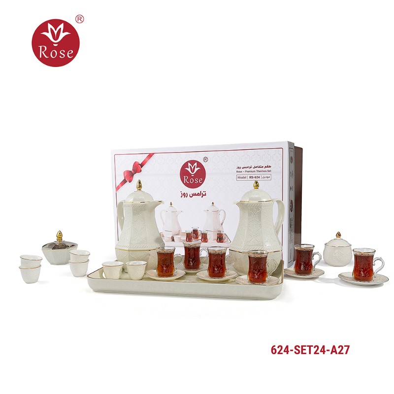 Rose Thermos Complete Set Model: 624-SET24 in a luxurious box containing: Tea Thermos 1-Litre + Coffee Thermos 1-Litre + 6-piece Coffee Cup + 6 Istkana Cup + 6 Saucers + Dates Bowl + Serving Tray 53*35.