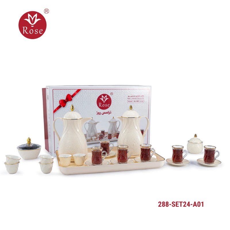 طقم ترامس روز المتكامل Model: 288-SET24 في بوكس فخم يحتوي على: ترمس شاي 1 لتر + ترمس قهوة 1 لتر + 6 فنجان قهوة عربي + 6 استكانات + 6 صحون + سكرية + تمرية + صينية تقديم بمقاس 53x35 سم
