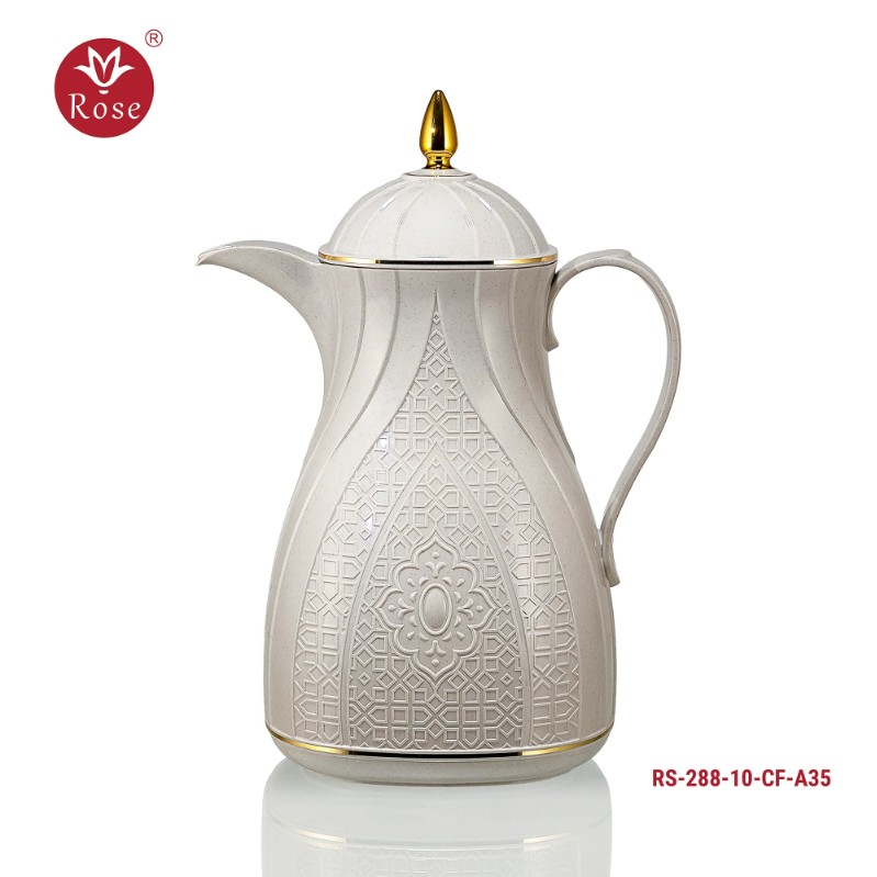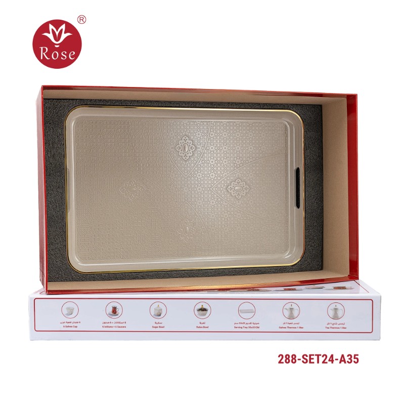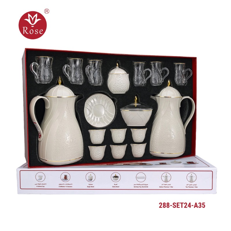 طقم ترامس روز المتكامل Model: 288-SET24 في بوكس فخم يحتوي على: ترمس شاي 1 لتر + ترمس قهوة 1 لتر + 6 فنجان قهوة عربي + 6 استكانات + 6 صحون + سكرية + تمرية + صينية تقديم بمقاس 53x35 سم