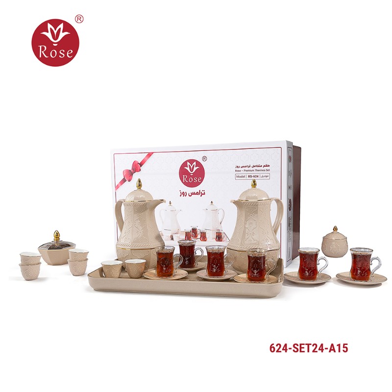 طقم ترامس روز المتكامل Model: 624-SET24 في بوكس فخم يحتوي على: ترمس شاي 1 لتر + ترمس قهوة 1 لتر + 6 فنجان قهوة عربي + 6 استكانات + 6 صحون + سكرية + تمرية + صينية تقديم بمقاس 53x35 سم