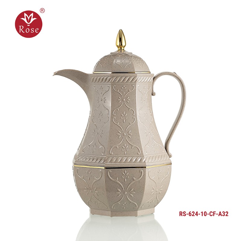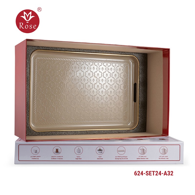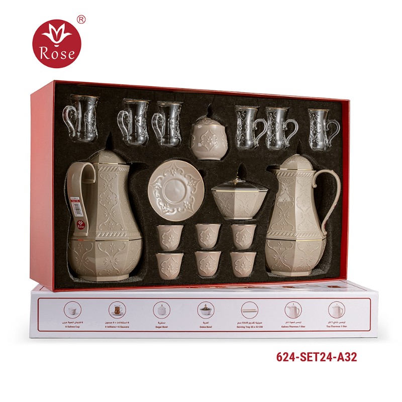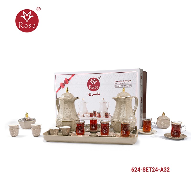 طقم ترامس روز المتكامل Model: 624-SET24 في بوكس فخم يحتوي على: ترمس شاي 1 لتر + ترمس قهوة 1 لتر + 6 فنجان قهوة عربي + 6 استكانات + 6 صحون + سكرية + تمرية + صينية تقديم بمقاس 53x35 سم