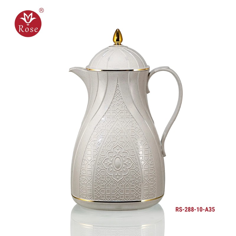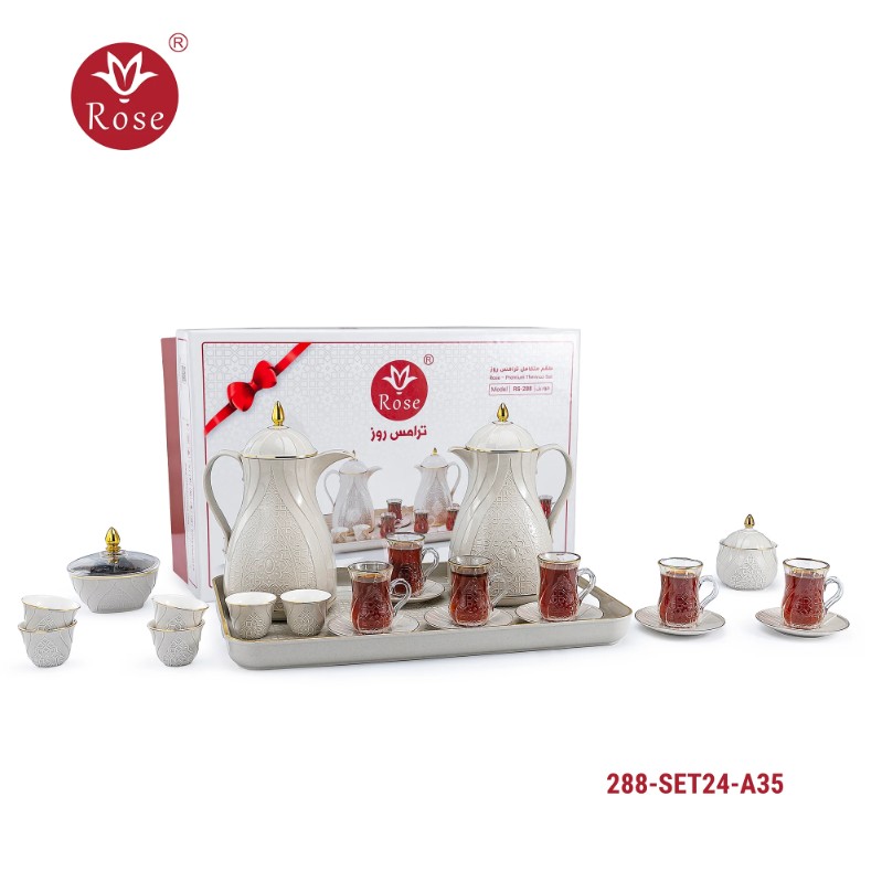 Rose Thermos Complete Set Model: 288-SET24 in a luxurious box containing: Tea Thermos 1-Litre + Coffee Thermos 1-Litre + 6-piece Coffee Cup + 6 Istkana Cup + 6 Saucers + Dates Bowl + Serving Tray 53*35.