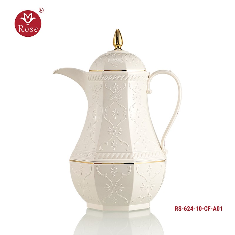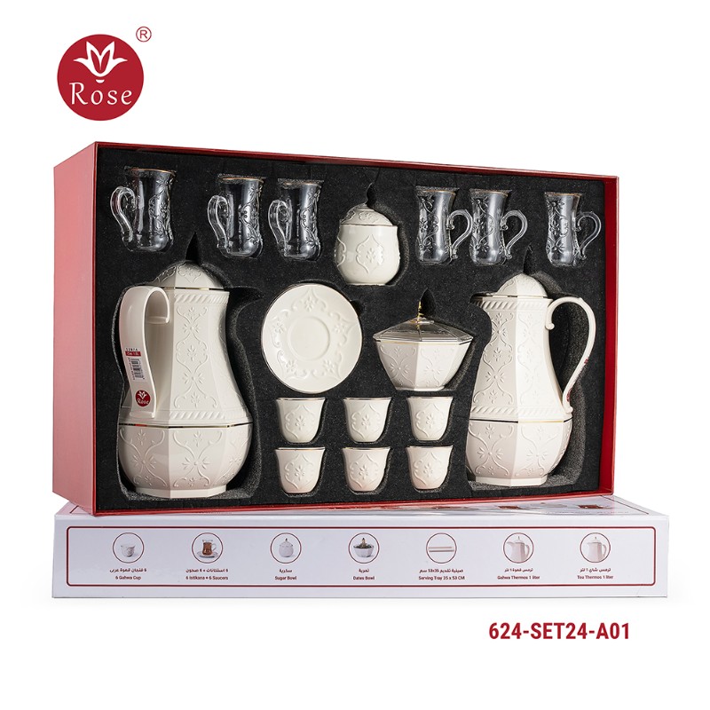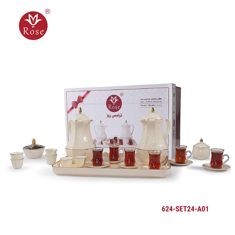 طقم ترامس روز المتكامل Model: 624-SET24 في بوكس فخم يحتوي على: ترمس شاي 1 لتر + ترمس قهوة 1 لتر + 6 فنجان قهوة عربي + 6 استكانات + 6 صحون + سكرية + تمرية + صينية تقديم بمقاس 53x35 سم