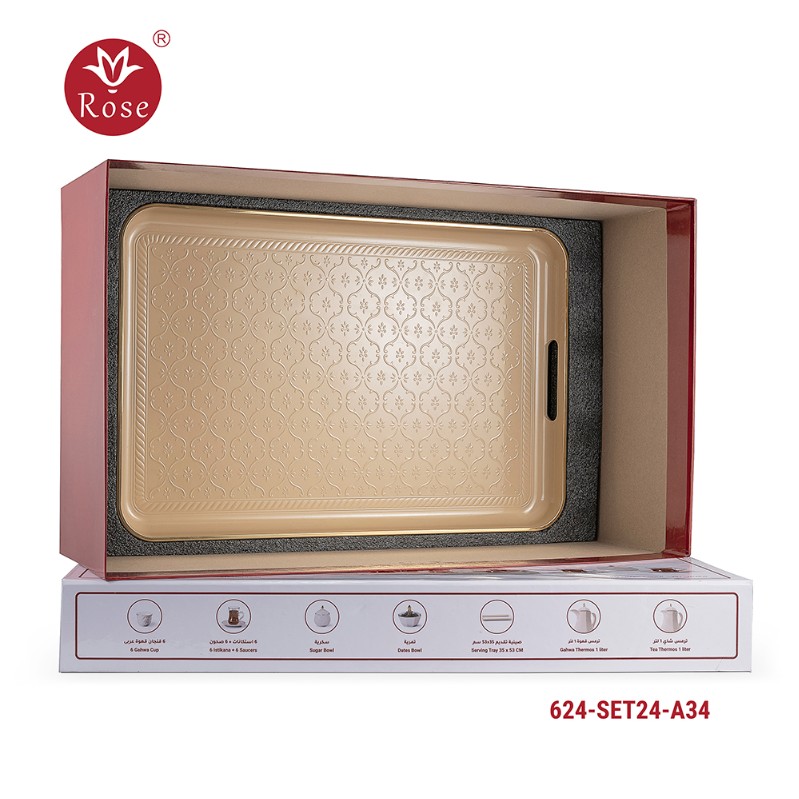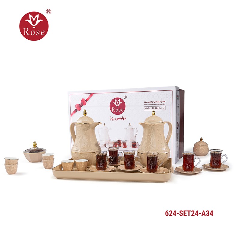 طقم ترامس روز المتكامل Model: 624-SET24 في بوكس فخم يحتوي على: ترمس شاي 1 لتر + ترمس قهوة 1 لتر + 6 فنجان قهوة عربي + 6 استكانات + 6 صحون + سكرية + تمرية + صينية تقديم بمقاس 53x35 سم